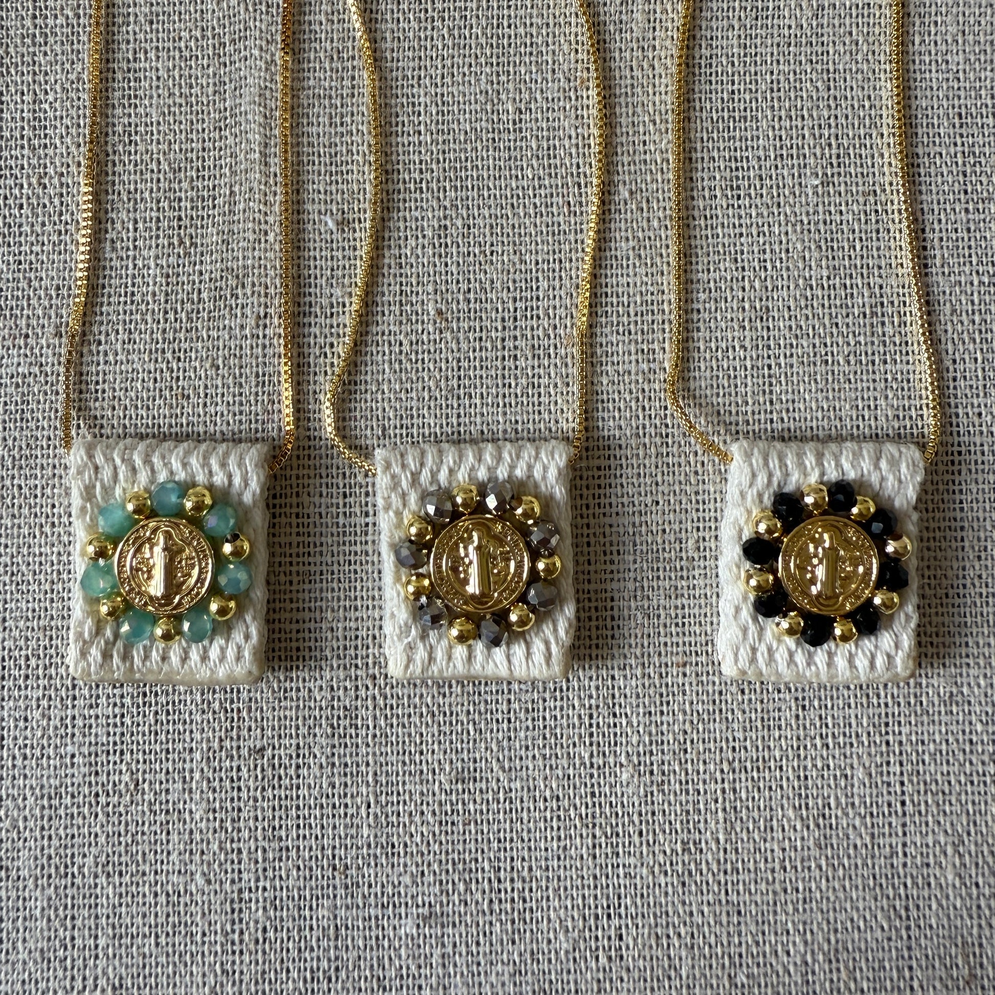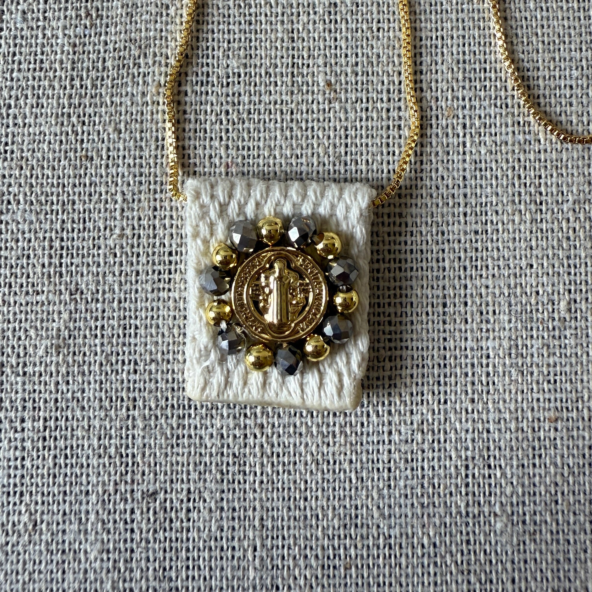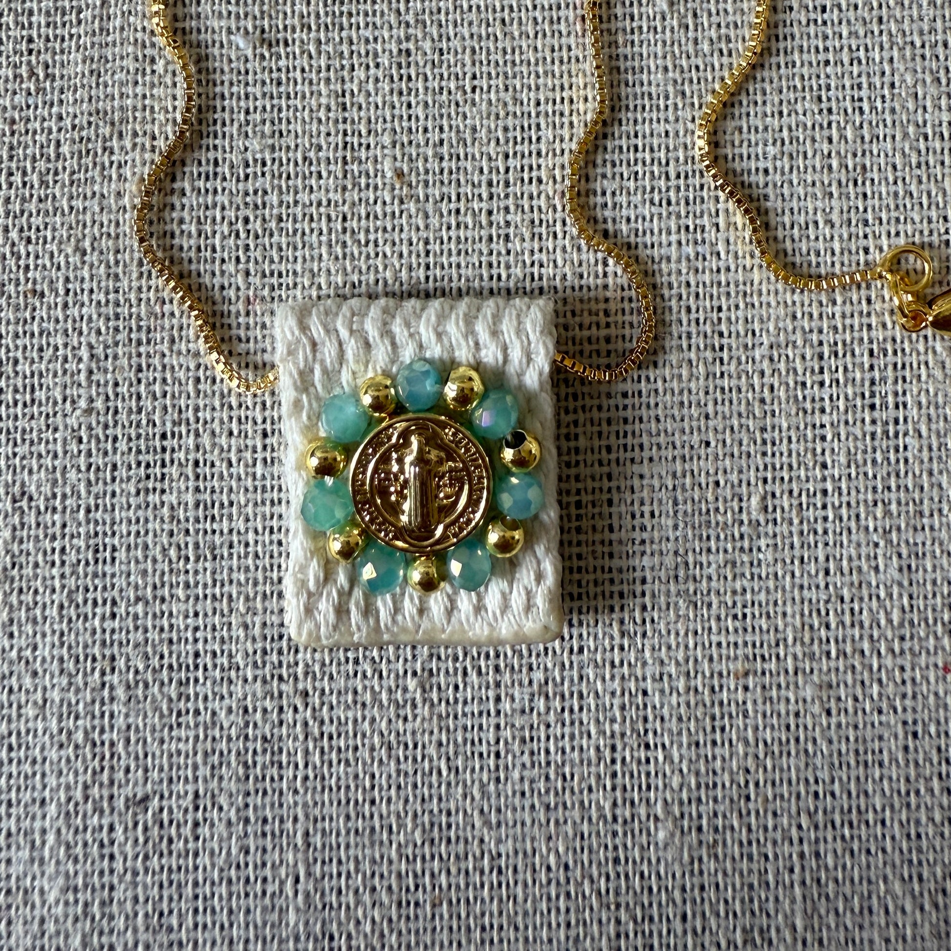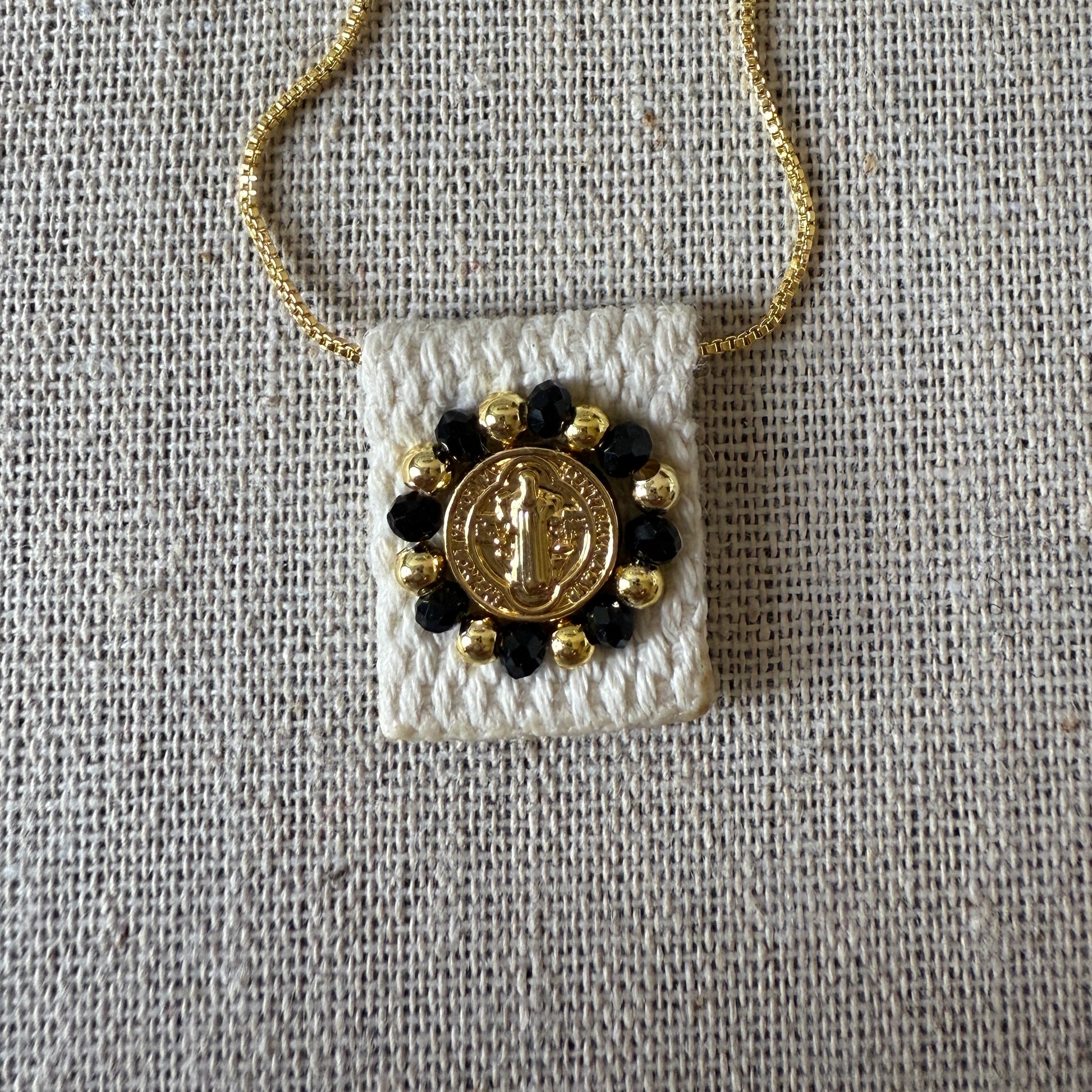 This handmade San Benito scapular necklace features the powerful Saint Benedict Medal, a Catholic symbol of protection, faith, and devotion. Designed for daily wear, it serves as a spiritual shield and reminder of God’s presence. Perfect as a gift or personal keepsake.