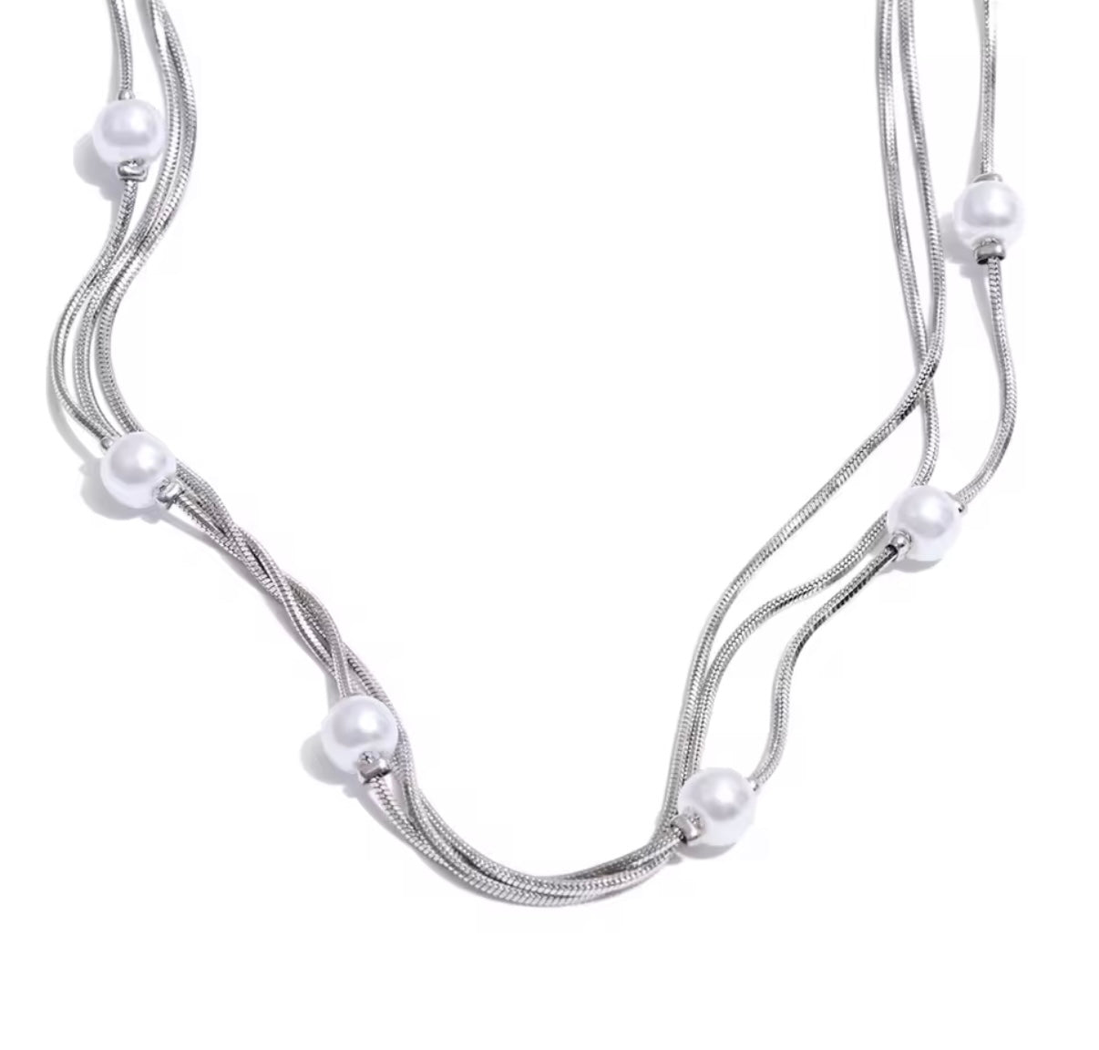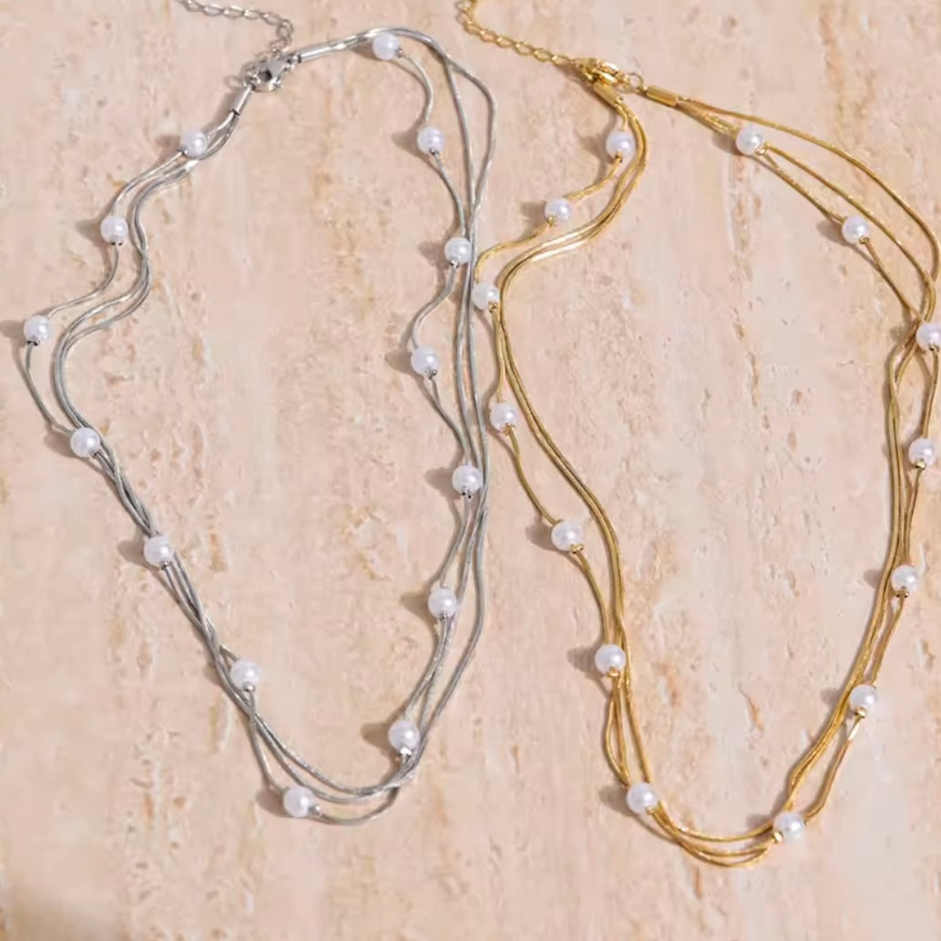 Gracefully delicate yet built to last, Luna Layers is your new everyday essential. This triple-strand necklace features fine stainless steel chains adorned with soft pearl beads, offering an ethereal layered look in one effortless piece.